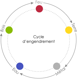 Le cycle constructeur va dans le sens naturel, nourricier de la nature : le Feu nourrit la Terre, la Terre crée le Métal, le Métal dynamise l’Eau, l’Eau fait croître le Bois et le Bois alimente le Feu.