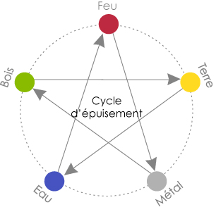 Le cycle d’apaisement (ou régulateur) harmonise les éléments : le Feu épuise le Bois, le Bois assèche l’Eau, l’Eau abîme le Métal, le Métal appauvrit la Terre et la Terre apaise le Feu.